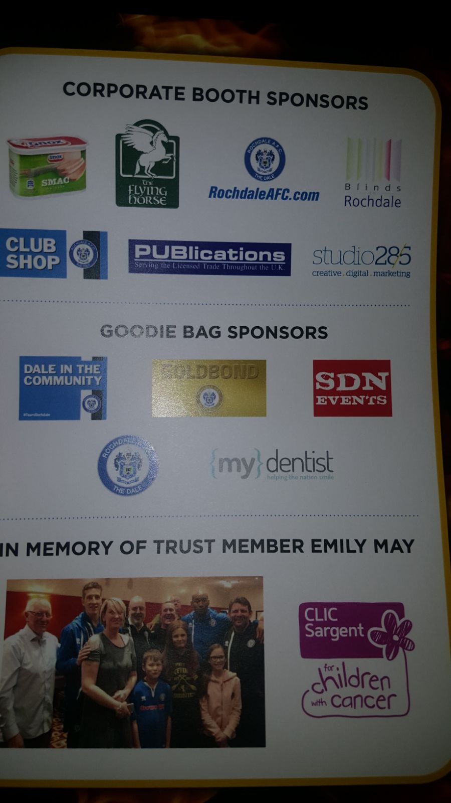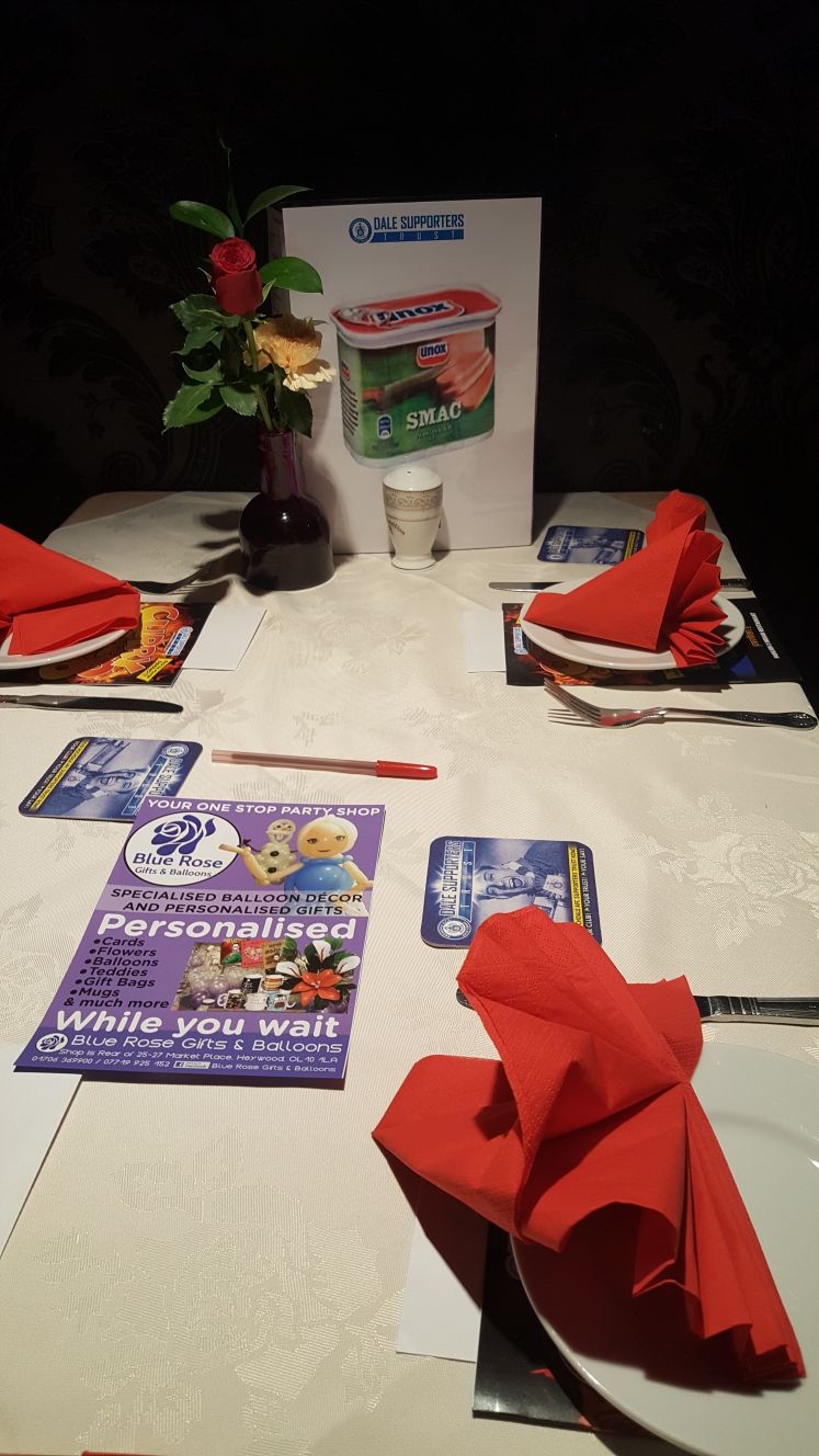 The Flying Horse Hotel, Studio 285, Afc.com/PUBlications, SMAC, Club shop & Blinds in Rochdale our corporate booth sponsors. RAFC for providing the PA system. Pavillion II for allowing us to host the event and providing excellent food. Studio 285 & Dale Print for providing design and printing services. Icon Sports for kindly donating Silent Auction Prize. Football In The Community, Funky Floral, Viccolo del Vino for providing raffle prizes. Mydentist for providing the dental goodies. Special thanks to Blue Rose Gifts & Balloons for providing the Dale themed table decorations. And thanks to The three legends, for kindly agreeing to be our event speakers.