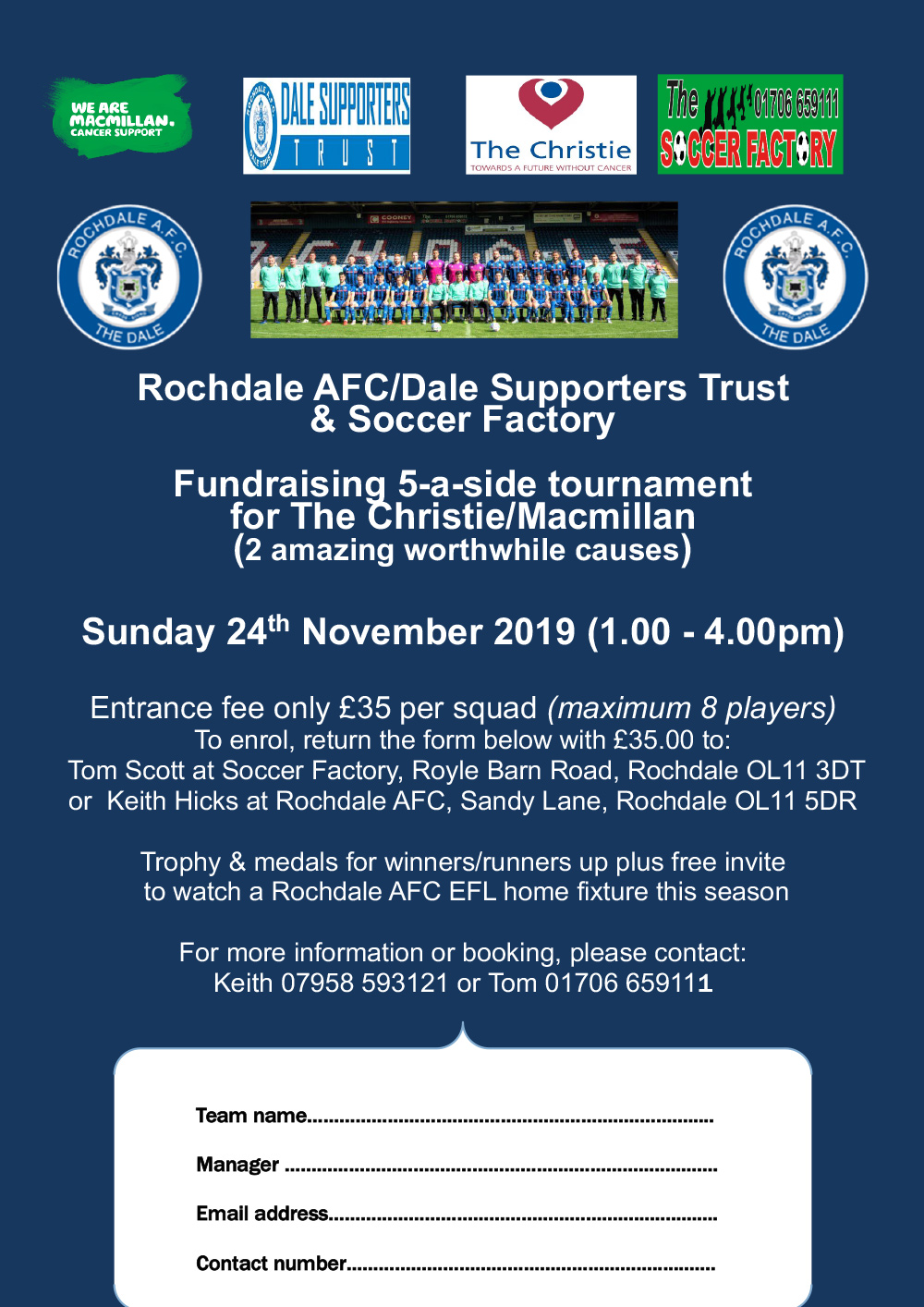 The event will take placed on Sunday 24th November, with an entry cost of £35 per team and will take place at the Soccer Factory. For more information, please contact Keith Hicks at keith.hicks@rochdaleafc.co.uk.