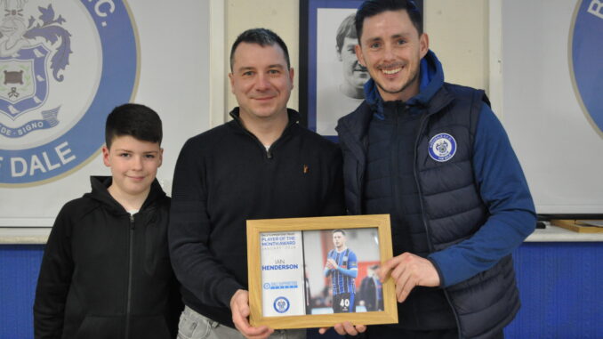 The presentation for the Player of the Month for January was made on Saturday after the game against Solihull Moors. The winner was Ian Henderson and the Trust member drawn to present him with his award was Anthony Britland. The photo shows Anthony and his son Fraser making the award, and, in return, Fraser received a framed copy signed with a personal message from Ian, which Fraser was delighted to accept.