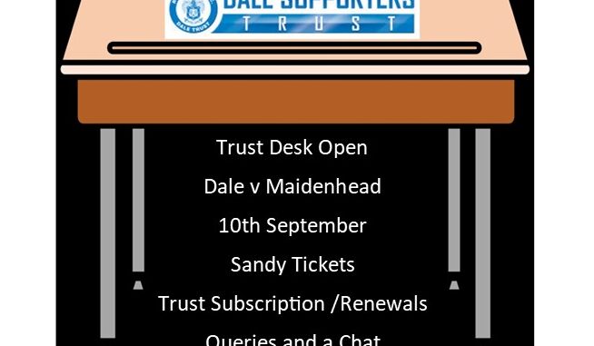 The Trust desk will be open as usual tonight in the Dale Bar (within the Ratcliff Suit for new members) before our game against Maidenhead.